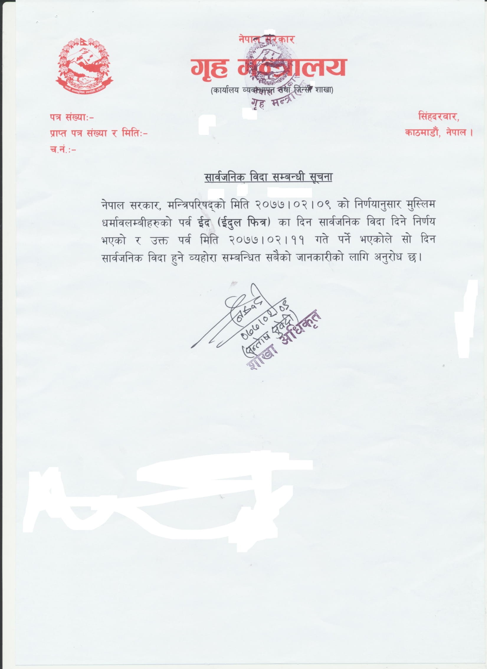 नेपाल सरकार मन्त्रिपरिषद्को निर्णानुसार मिति २०७७/०२/११ गते भनिएको सार्वजनिक विदा मिति २०७७/०२/१२ गते हुने सम्बन्धि सूचना