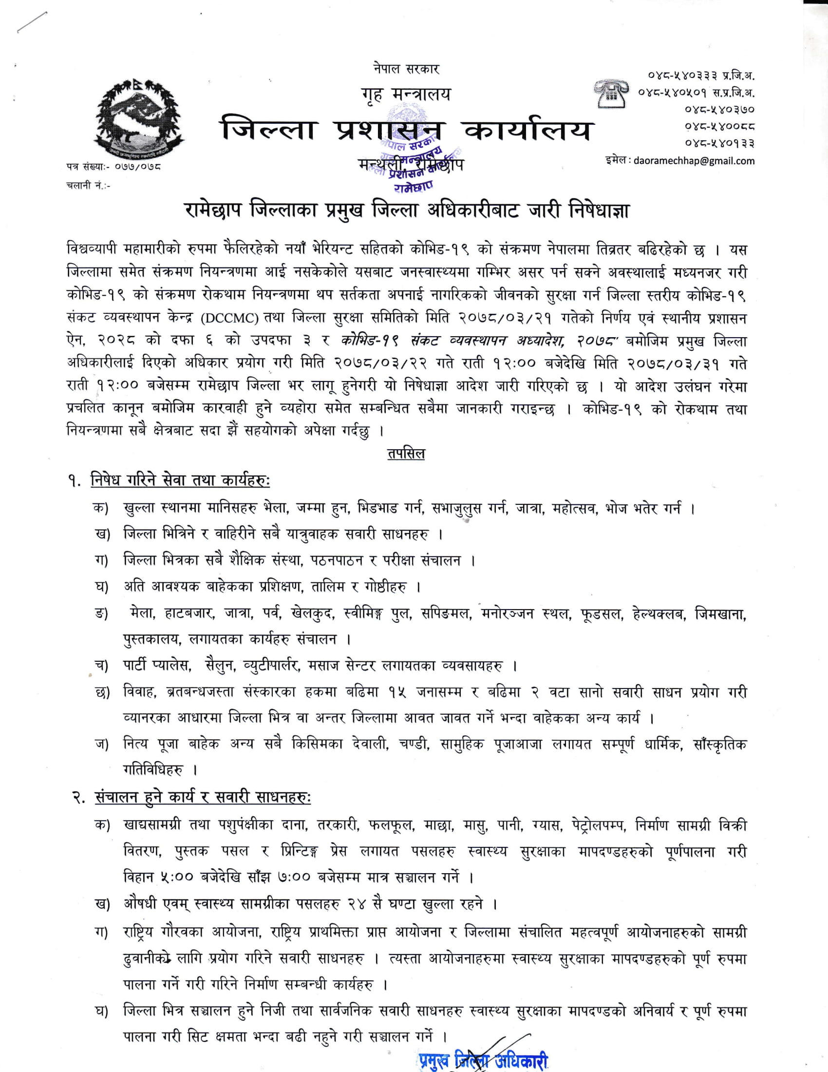जिल्ला प्रशासन कार्यालय रामेछापबाट जारी निषेधाज्ञा (२०७८/०३/२१)