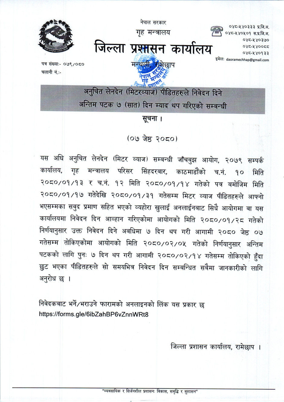 अनुचित लेनदेन (मिटरव्याज) पीडितहरुले निवेदन दिने अन्तिम पटक 7 (सात) दिन म्याद थप गरिएको सम्बन्धी सूचना !