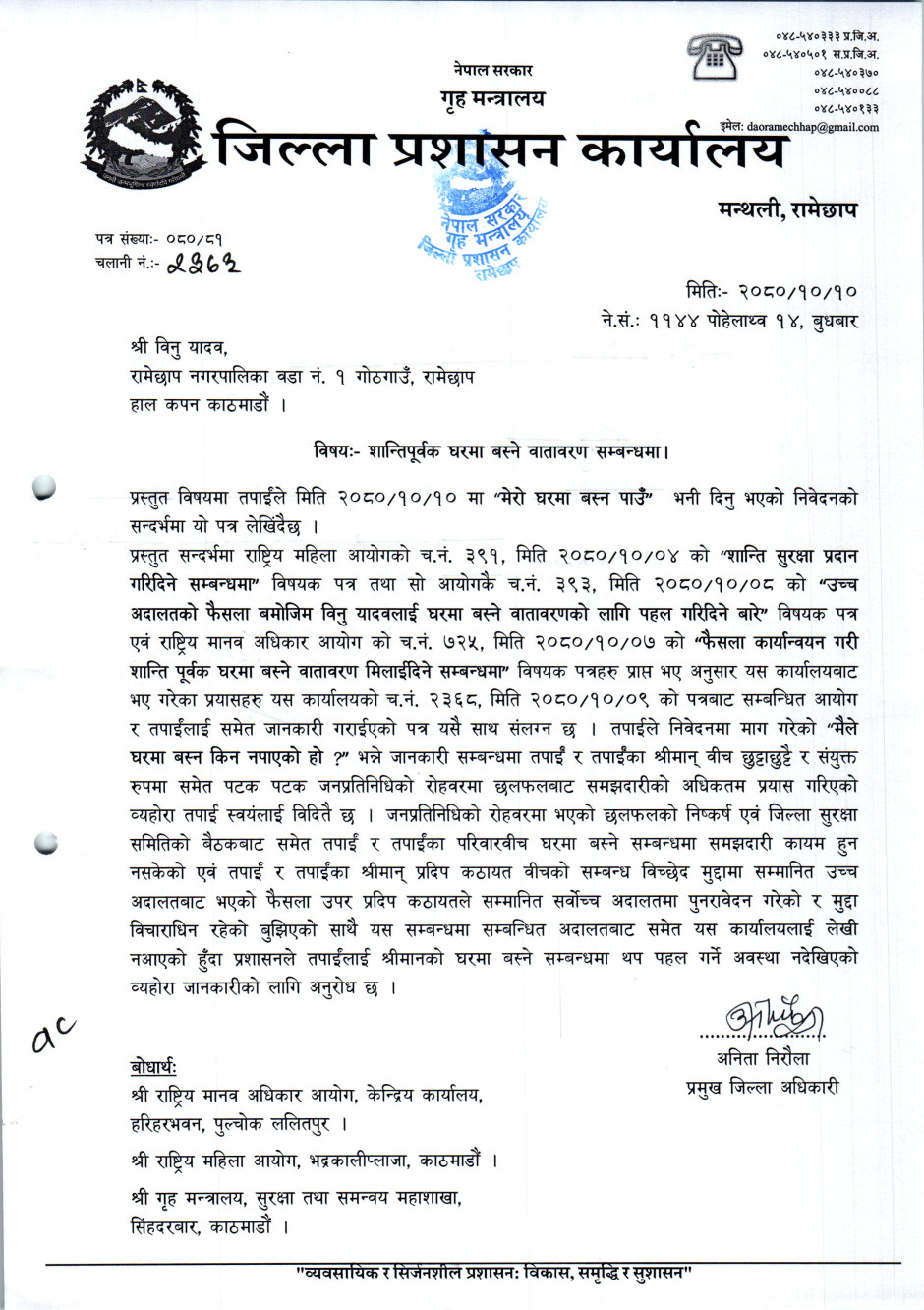 अनसनरत विनु यादवले जानकारी माग गरी दिएको निवेदनका सम्बन्धमा निजलाइ जानकारी गराइएको पत्र (निजले बुझ्न इन्कार गरेको) 2080-10-10