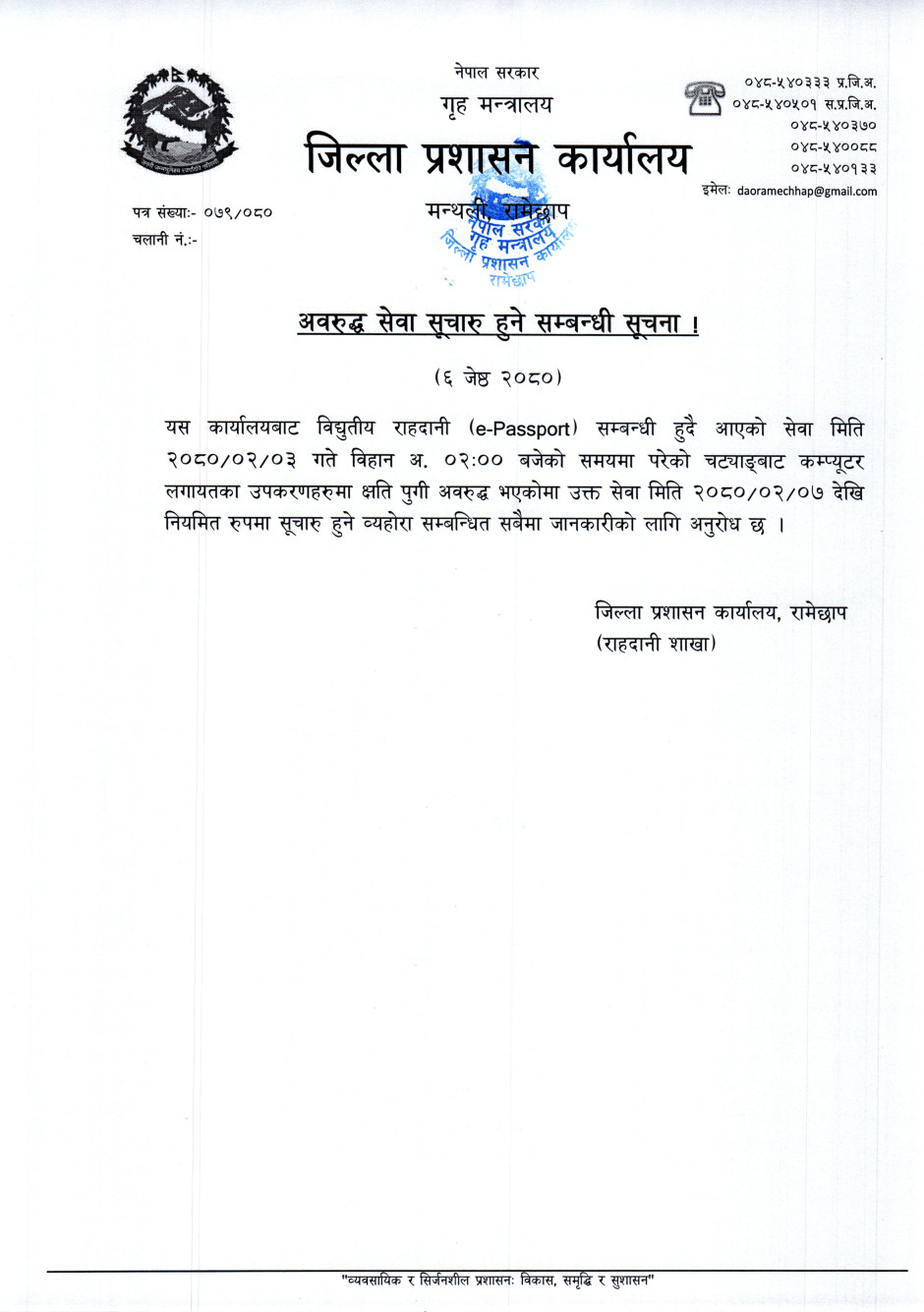 © सर्वाधिकार सुरक्षित जिल्ला प्रशासन कार्यालय, रामेछाप