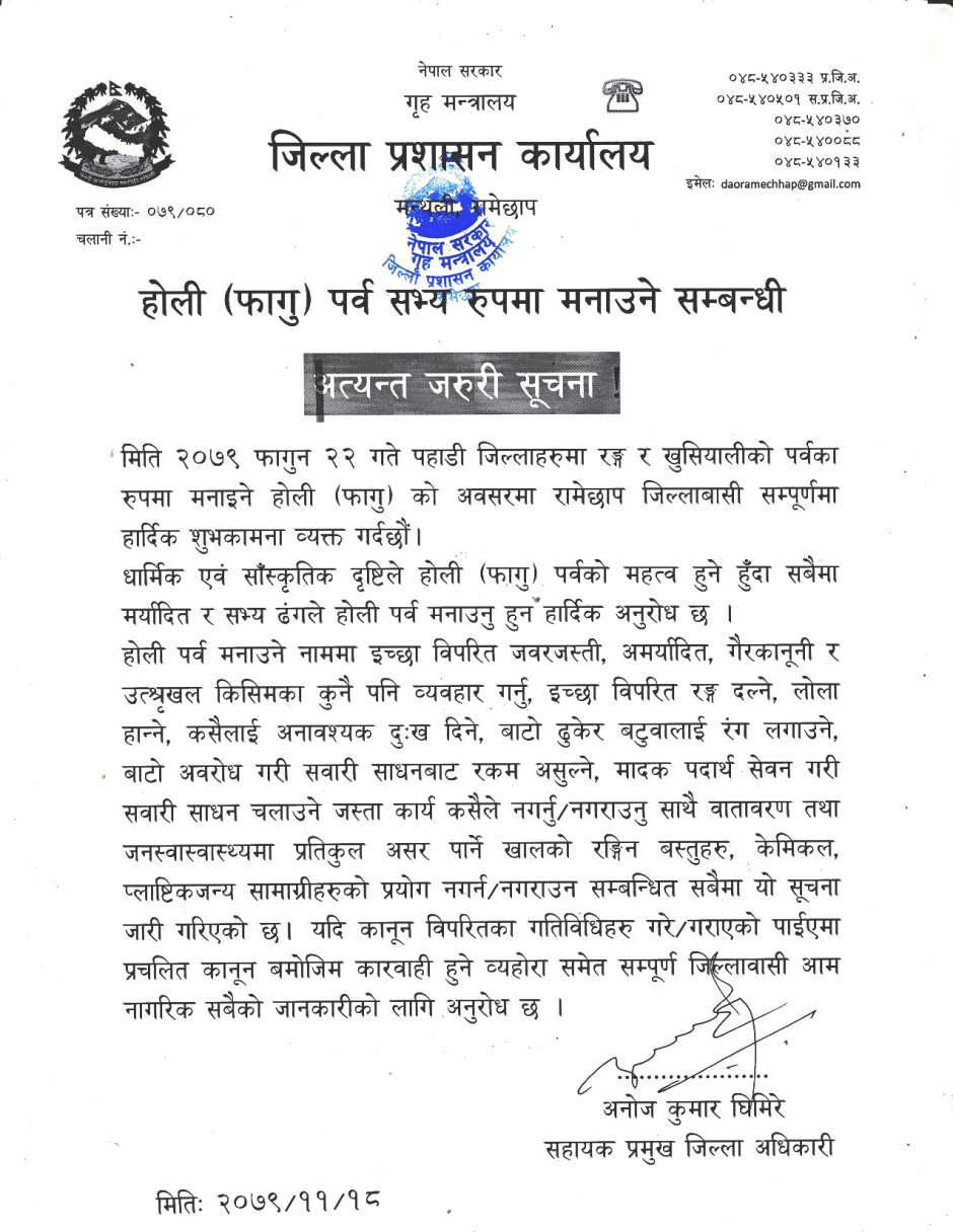 होली (फागु) पर्व सभ्य रुपमा मनाउने सम्बन्धी (अत्यन्त जरुरी सूचना)