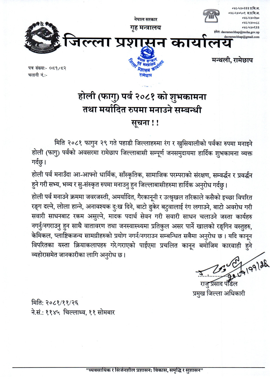 © सर्वाधिकार सुरक्षित जिल्ला प्रशासन कार्यालय, रामेछाप