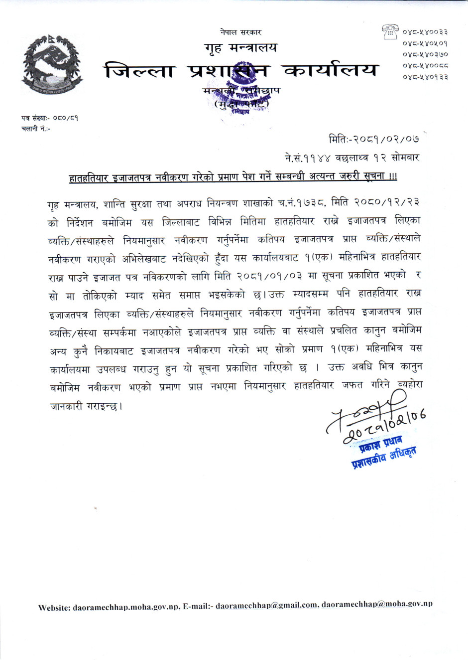 हातहतियार इजाजतपत्र नवीकरण गरेको प्रमाण पेश गर्ने सम्बन्धी अत्यन्त जरुरी सूचना