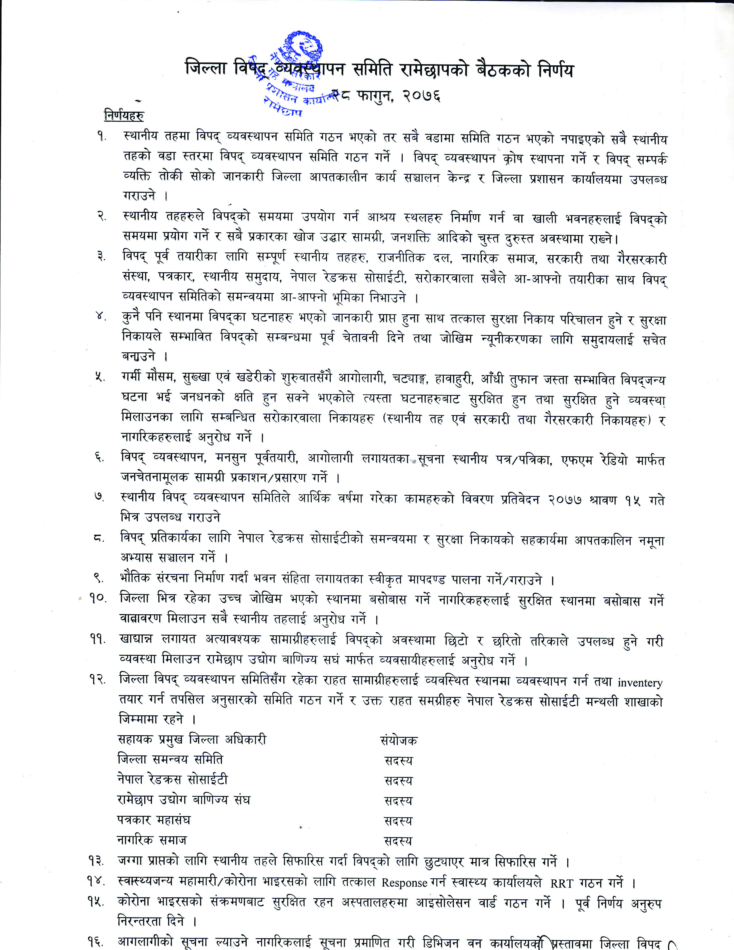 जिल्ला विपद् व्यवस्थापन समिति रामेछापबाट भएको निर्णयहरु ()2076-12-28)
