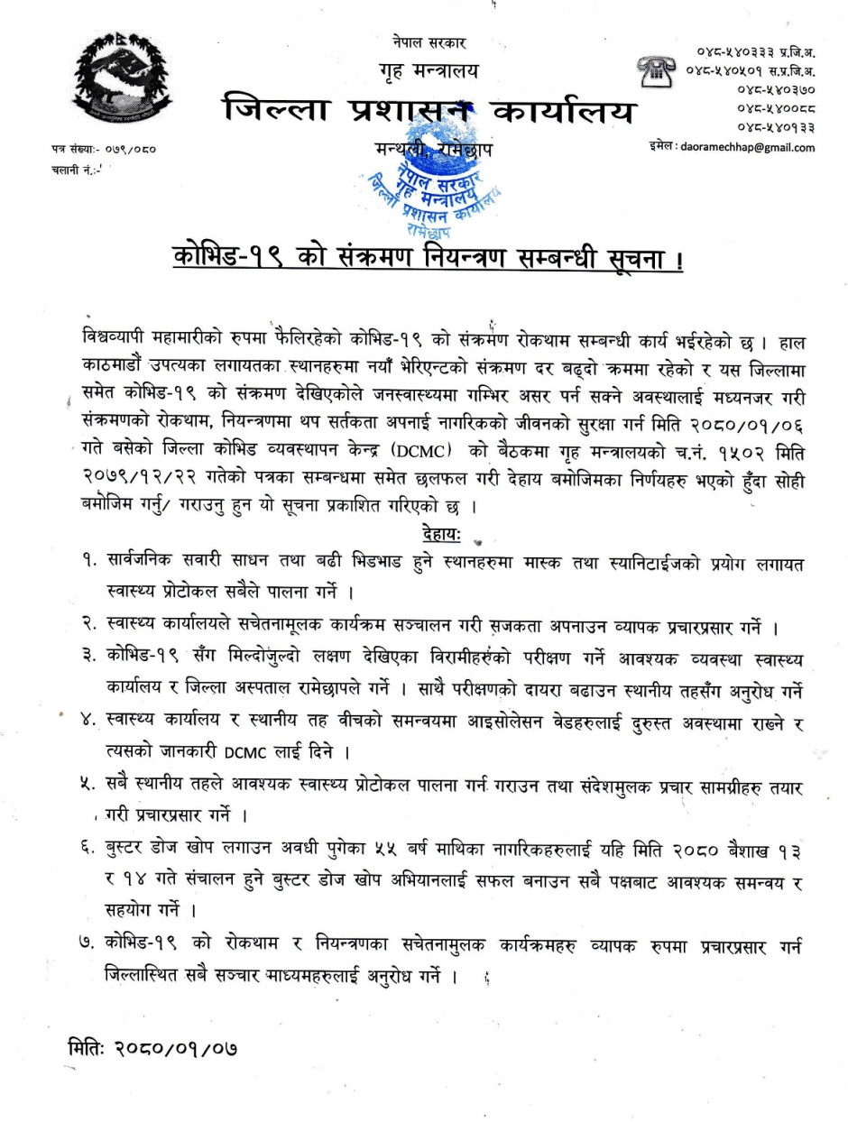© सर्वाधिकार सुरक्षित जिल्ला प्रशासन कार्यालय, रामेछाप