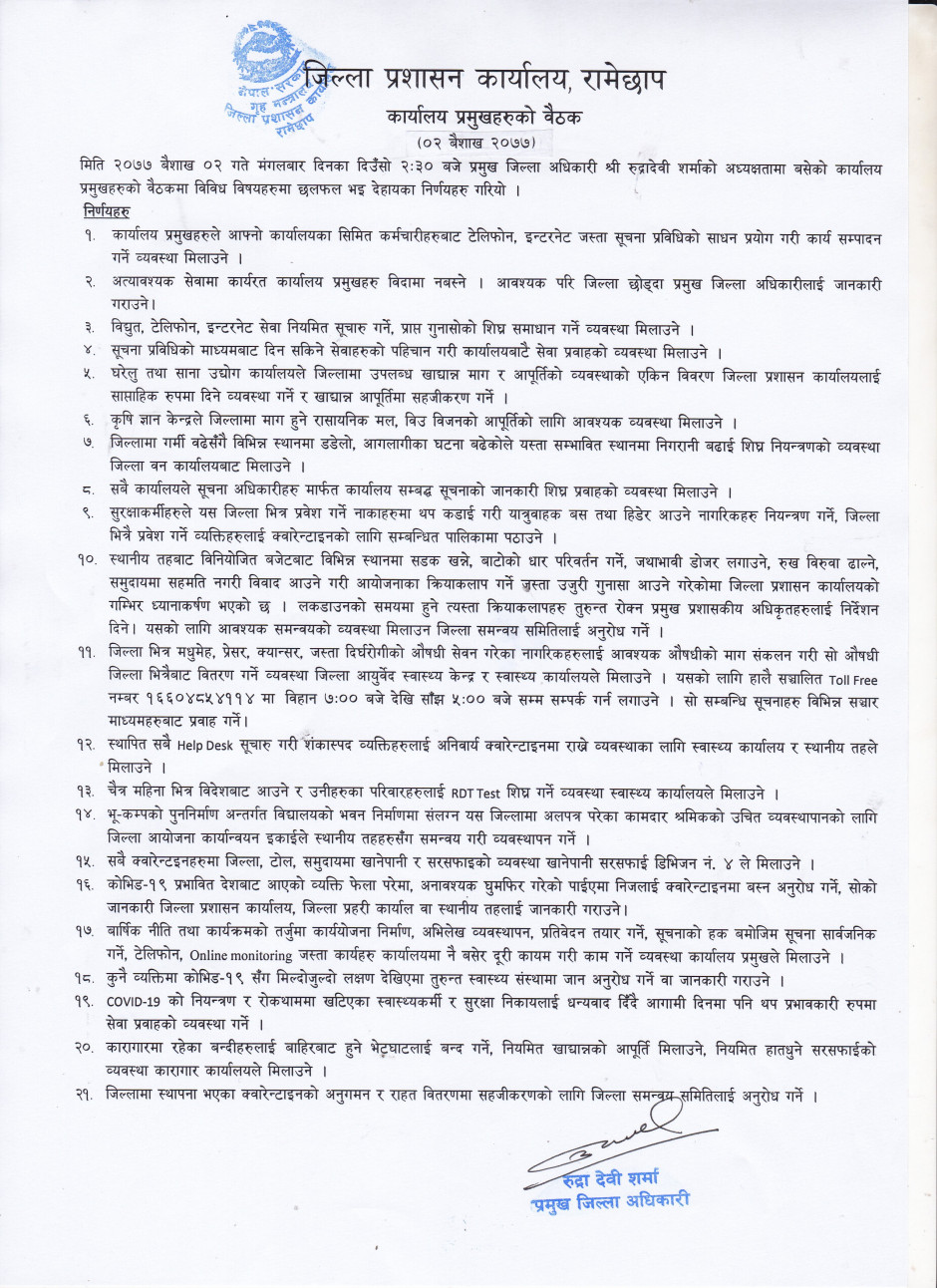 कार्यालय प्रमुखको बैठकबाट भएका निर्णयहरु (२०७७ बैशाख ०२)