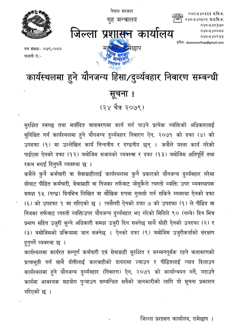 कार्यस्थलमा हुने यौनजन्य हिंसा/दुर्व्यवहार निवारण सम्बन्धी सूचना !