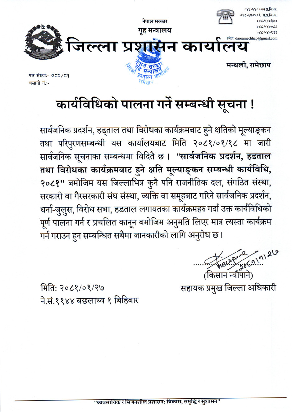 सार्वजनिक प्रदर्शन, र्याली, सभा जस्ता कार्यक्रम गर्दा अनुमति लिने सम्बन्धी सूचना ! -२०८२/०७/१२