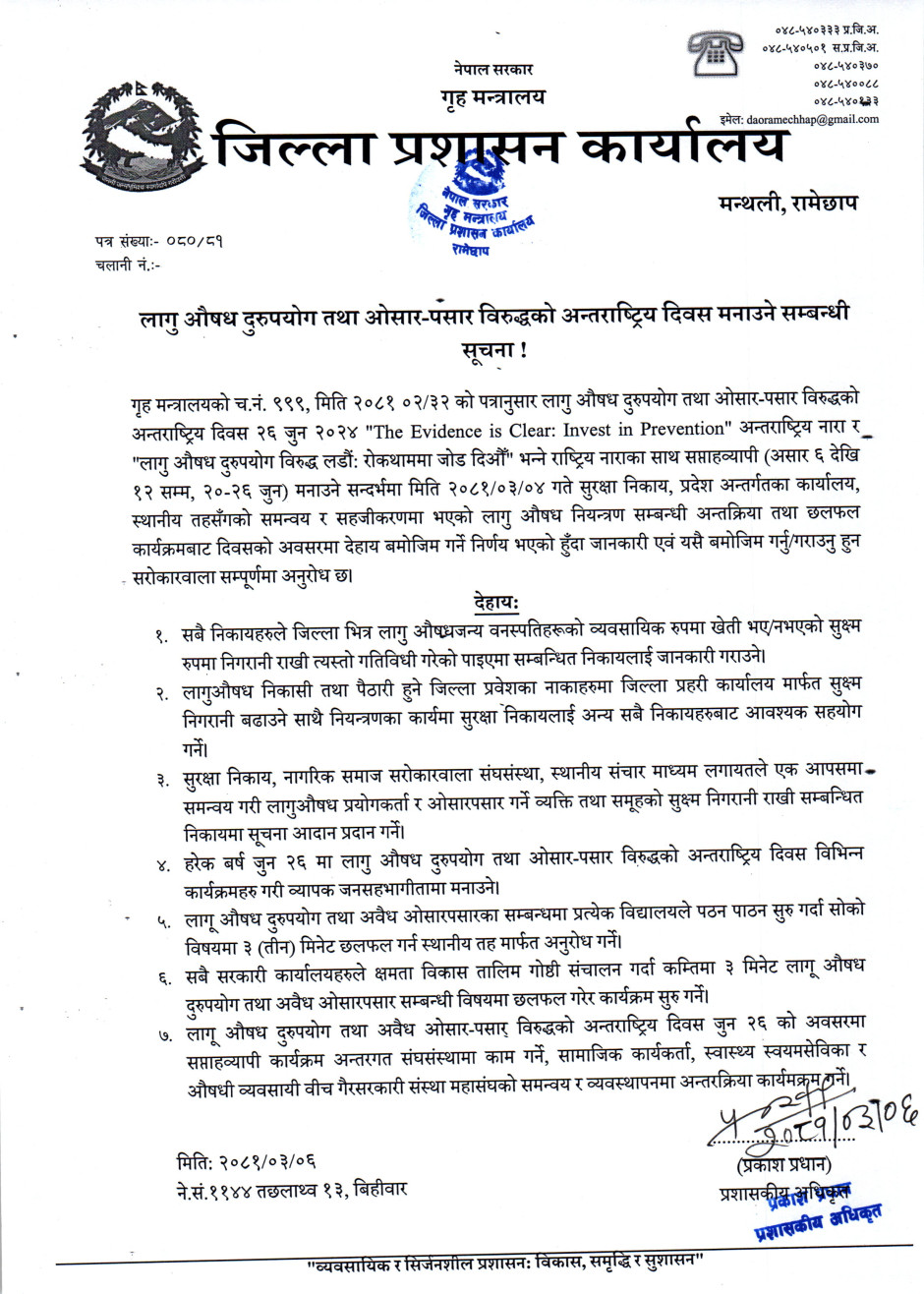 लागु औषध दुरुपयोग तथा ओसार-पसार विरुद्धको अन्तराष्ट्रिय दिवस मनाउने सम्बन्धी सूचना !
