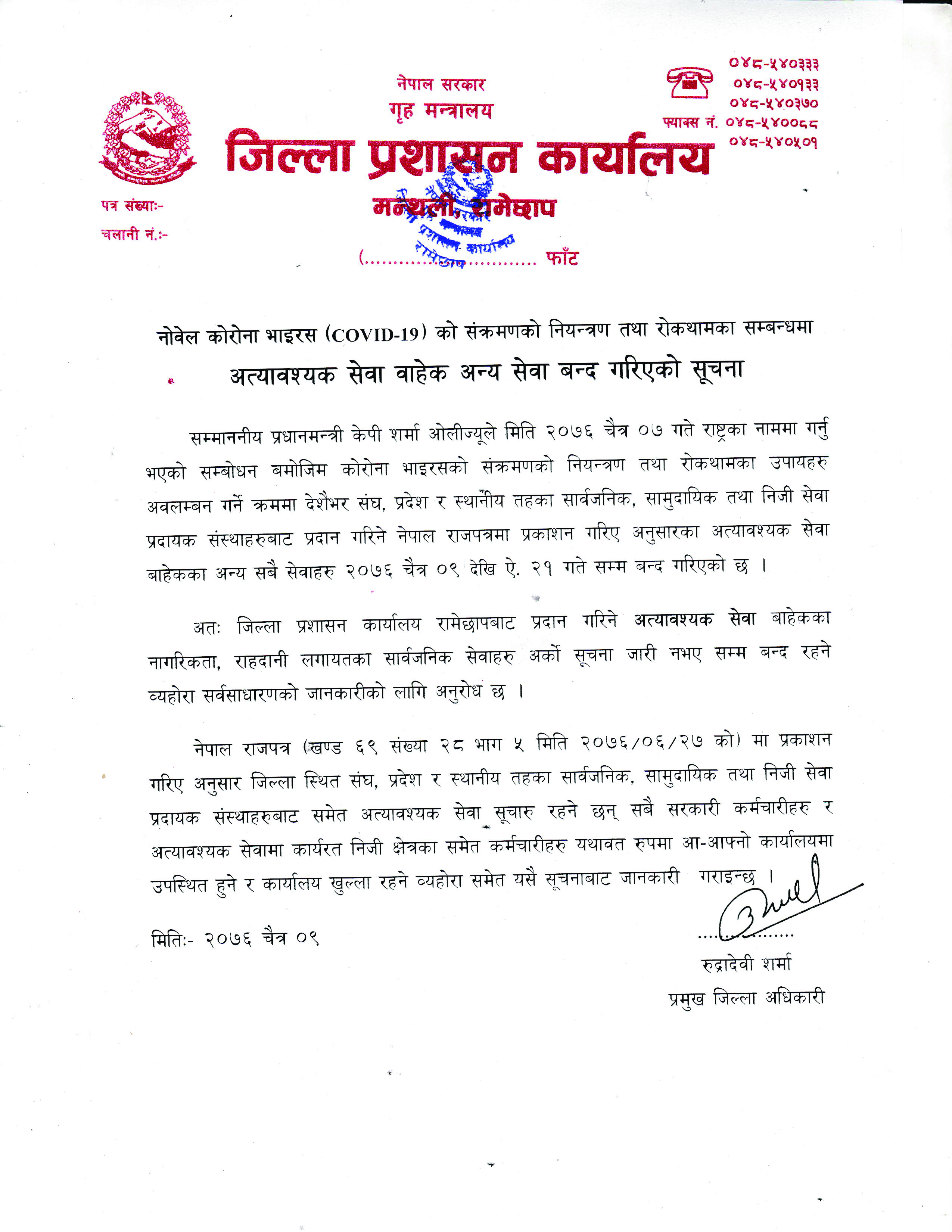 नोवेल कोरोना भाइरस (COVID-19) को संक्रमणको नियन्त्रण तथा रोकथामका सम्बन्धमा अत्यावश्यक सेवा वाहेक अन्य सेवा बन्द गरिएको सूचना