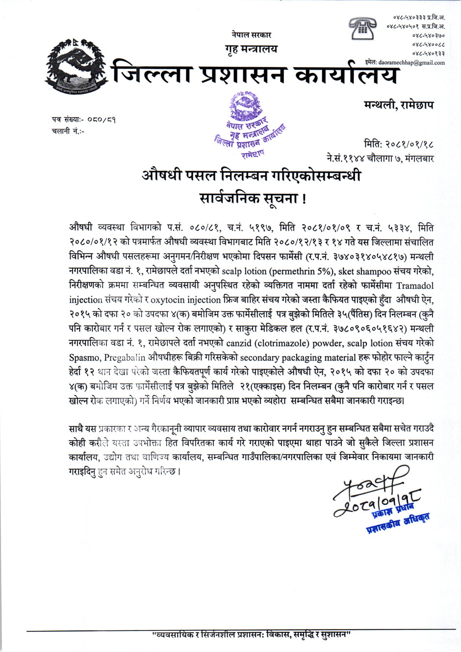 औषधी पसल निलम्बन गरिएको सम्बन्धी सार्वजनिक सूचना